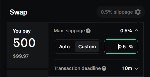 This means that with a slippage of 0.5%, you could receive up to 0.5% fewer tokens than expected on the preview swap screen depending on market conditions. \