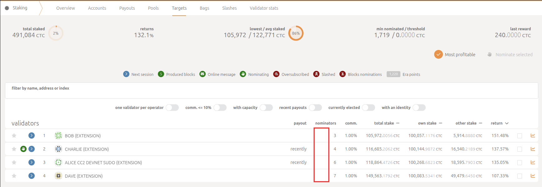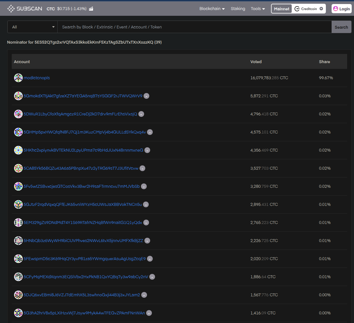 As well as checking individual nominators per validator and their stake by clicking on the number of nominators <https://creditcoin.subscan.io/nominator?address=5ES52Q7gs2xrVQTAxS3kkoEkKmF5XzTAgSZbU7xTXnXozzKQ>