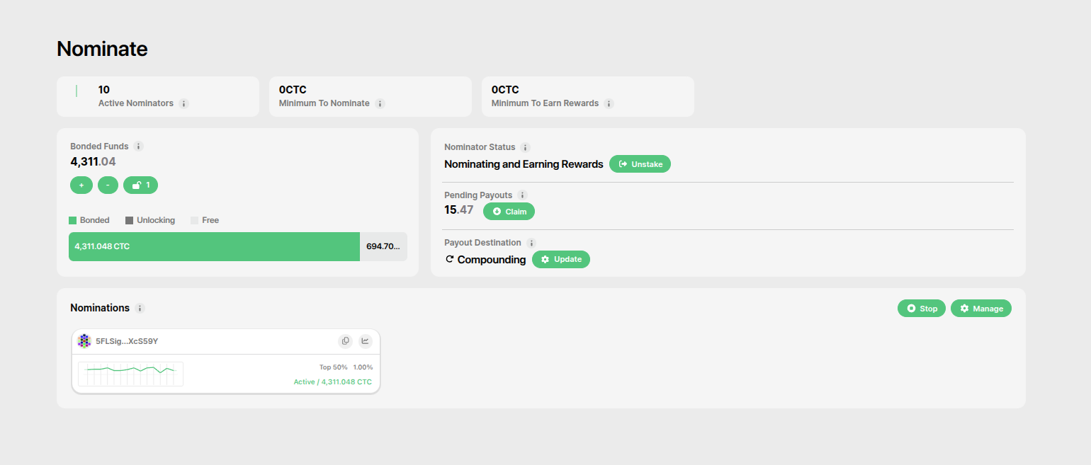 If you need more details about your specific nominations, you should head over to the Creditcoin3 Staking Dashboard, which will display every detail correctly for your specific nominations, as well as the number of total active nominators, together with the pending payout amounts for the past 7 days.