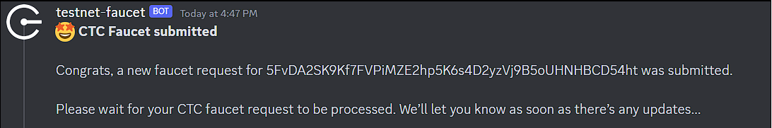 4. Upon submission, the bot will promptly acknowledge the request with a confirmation message stating "CTC faucet submitted”.